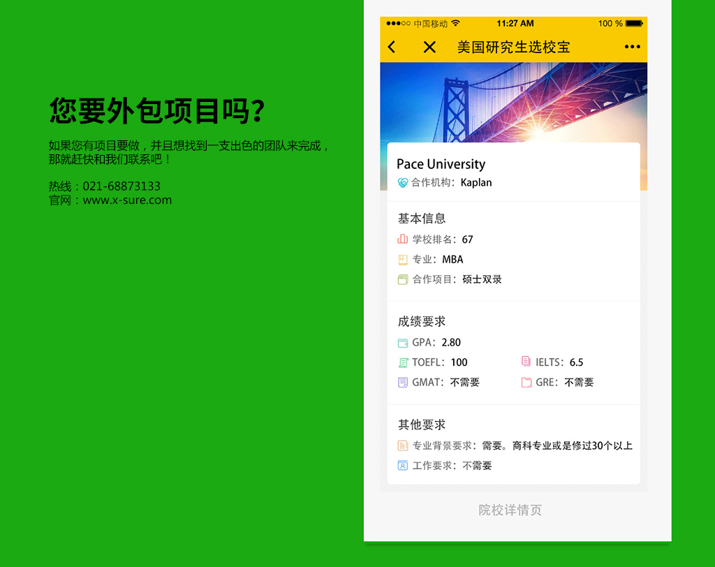 美研選校寶(合作院校)微信小程序項目,已在線上進行試運行,掃描小程序碼進入小程序。